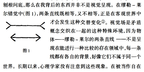 先对“感觉”进行回顾。一般人们对于事物的认识,主要是从事物的“性质”进行入手。比如,当我们为了辨别红色与绿色的差别时,我们在大脑意识中已经有了针对红色与绿色的性质认识,才在这个基础上对事实的红色绿色进行辨别。但一种论述忽略了一种身体感知能力在瞬间感知方面的现象,而这种现象在猴、鸡身上体现的十分明显——猴、鸡对于最简单事实的了解,是关系,而不是从已有意识提取出来的绝对术语,前者也在人身上有所体现,并且是一种人的本能反应。从这里入手,梅洛庞蒂将人们对于事物的“实际知觉”分成了这几个流程,1-现象(事实知觉),也就是马上感受到的内容,2-“印象”、“偶然性”,这种可以被描述为一种情境式的存在,是一种“找不到”也“感觉不到”的自然过程物,3-知觉(实际知觉),也就逐渐过渡到了感觉层面。用一个例子来说明:当我们看到地毯上的一个红点时,只有考虑到贯穿红点的阴影部分,才能认为它是红色的,只有其性质仅在与光线作用的关系中,才显现为一种空间形状的成分,换一句话说,我们对于事物的认知参照了当下的情境,并且对于其性质的认知也是如此,而且,当下的认知先于性质的认知。对于后者,作者又举了缪勒莱尔错觉,来说明就算性质近乎相似,不同的情境确实导致了不同的知觉感受。